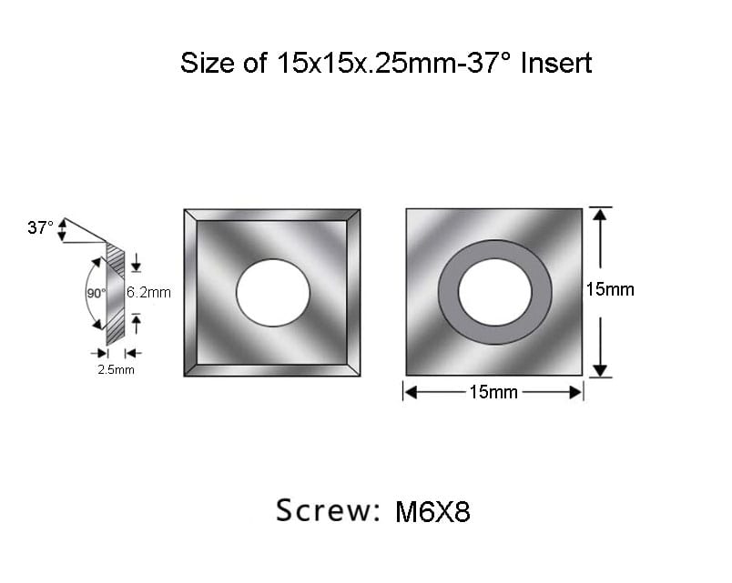 This size 15x15x2.5mm-37° square shape replacement carbide insert knife is designed for helical cutterhead for planer or jointer.